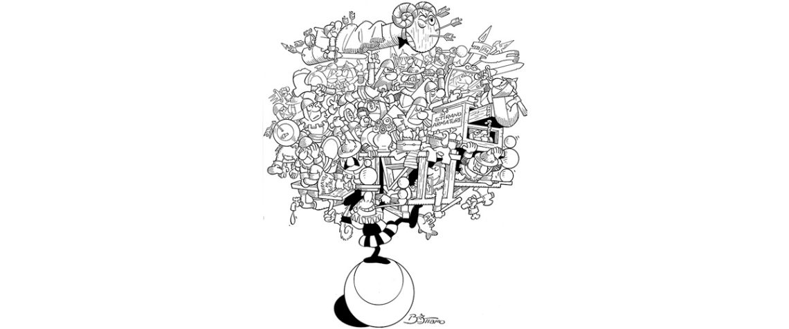 Il paragone non sembri casuale o irriverente. Pur nella loro giocosità, anche le Mattaglie, come l’omino coi baffi, inducono a riflettere sulla guerra, sulla futilità di conflitti che, seppure risolti qui sul piano di un humour sottile e allusivo, non perdono nulla della loro essenza vana. Ecco allora che la piccola, incisiva interiezione, corollario necessario e sufficiente ad ogni singola Mattaglia, il motto di incongruo (per il contesto, ovviamente) spirito che sottolinea l’intero edificio grafico, colpisce l’osservatore con la stessa forza dei silenzi di Charlot.