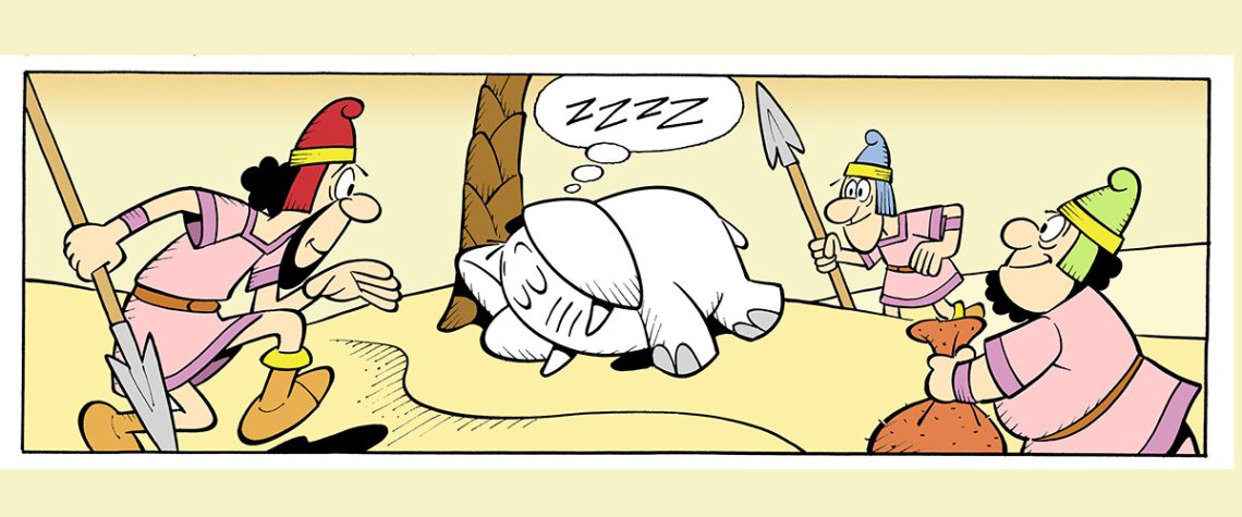 Nell’episodio successivo, di trenta tavole, Pousslabal, spinto dalla nostalgia per la sua terra natia – l’Africa – fugge dal giardino della regina Didone, a Cartagine. Durante la sua folle corsa Pousslabal incontra il branco di amici da cui si era involontariamente staccato e li trascina con sè. La fuga coinvolge inevitabilmente anche il grande generale Annibale, il quale, per inseguire i pachidermi fuggitivi, si ritrova, senza volerlo, in Italia, e più precisamente alle porte di Roma: un’occasione unica per conquistare la città che, per colpa degli elefanti, non riuscirà però ad attuare.