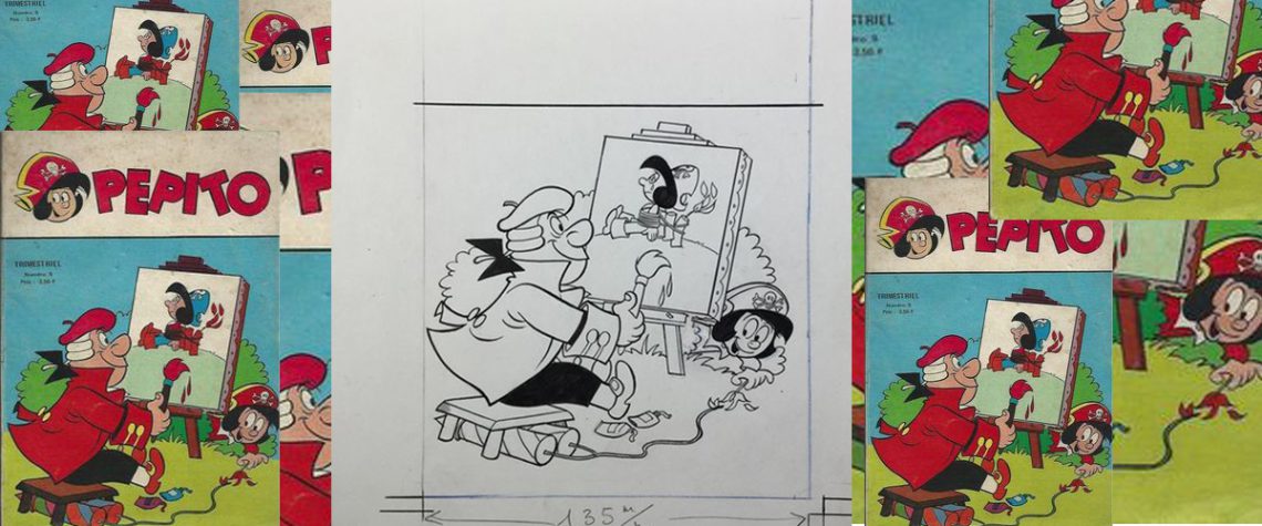 Il disegno è sicuramente l’originale, più indicazione di colore su carta velina, come si usava all’epoca, della copertina di Pepito poche n° 9 del 1975, ma l’autore è Guido Scala, disegnatore anche della storia in apertura di fascicolo, ” Île au trésor… volant “.