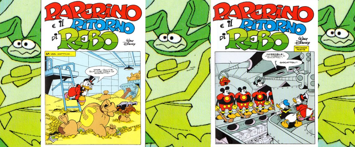 “… Paperino e il ritorno di Rebo, questo il titolo della storia di apertura di questo numero di Grandi Classici Disney, è piena di stupore e colore, pagina dopo pagina. Merito di un’artista, appassionato di cinema e fumetti, con lo sghiribizzo di giocare con i personaggi Disney, strapazzandoli come fossero di gomma. Rebo è il signore assoluto di Saturno, la cui popolazione dopo anni di guerra contro i gioviali (i simpatici abitanti di Giove) si è ridotta a soli tre individui. Rebo stesso e i suoi due generali (1 e 2 appunto. …”