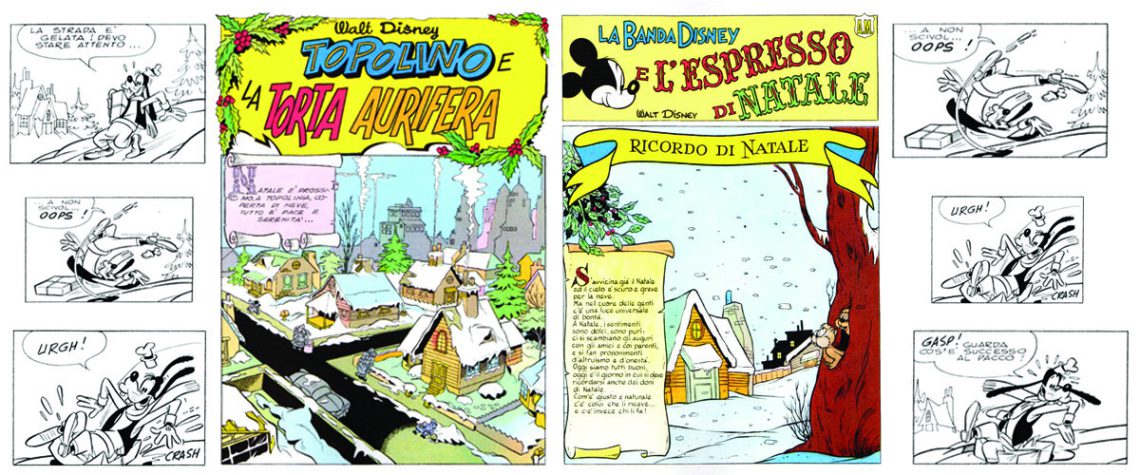Realizzate entrambe negli anni Sessanta per l’ Almanacco di Topolino, le due storie sono: “Topolino e la torta aurifera” (1964) e “La Banda Disney e l’espresso di Natale” (1960).