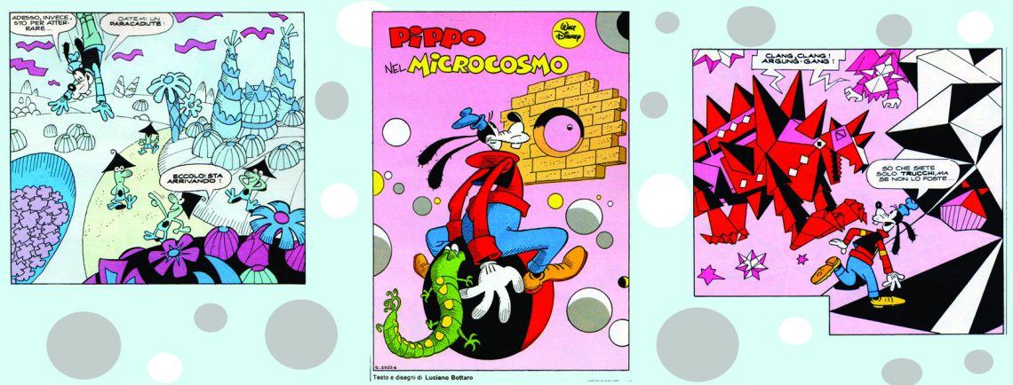 Bottaro, utilizza come prestesto la laurea in micronizzazione che Nocciola deve assolutamente conseguire per poter mantenere il titolo di strega, per mettere in scena un’avventura di quelle che amava lui e che hanno caratterizzato la sua produzione disneyana a partire dagli anni Novanta. Storie che sconfinando in mondi immaginari, gli offrivano la possibilità di esprimersi liberamente dal punto di vista grafico. In questo caso è Pippo, estratto a sorte come cavia per l’esame di Nocciola,ad accompagnarci in un viaggio che attraversa prima strato delle polveri, poi la foresta delle muffe, per continuare nello spazio dei cristalli neri e terminare in mezzo a virus e batteri, il tutto in un’interpretazione tipicamente bottariana, in cui anche la colorazione gioca un ruolo fondamentale.