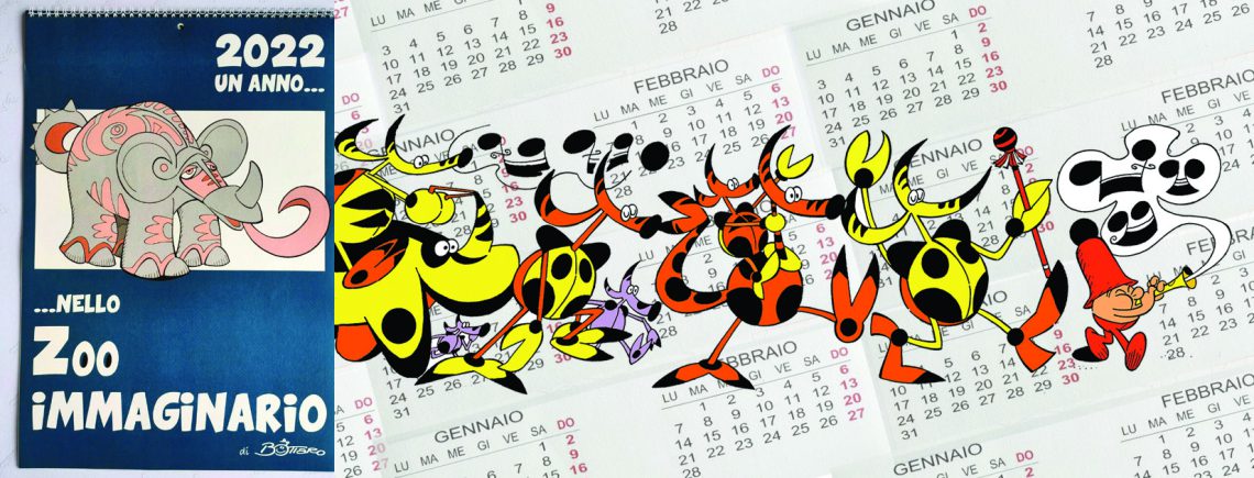 Dopo aver fatto le scansioni direttamente dalle tavole originali le abbiamo colorate seguendo rigorosamente le indicazioni di Luciano, cercando, per quanto possibile in digitale, di avvicinarci all’effetto “pastello” che le caratterizza, abbiamo aggiunto qualche dettaglio in fase di impaginazione, sostituito il 1998 con il 2022, concordato con la tipografia, Cromaticaprinting, una carta che lo valorizzasse nel modo giusto, ed ecco il calendario “2022… un anno nello zoo immaginario di Bottaro“.
