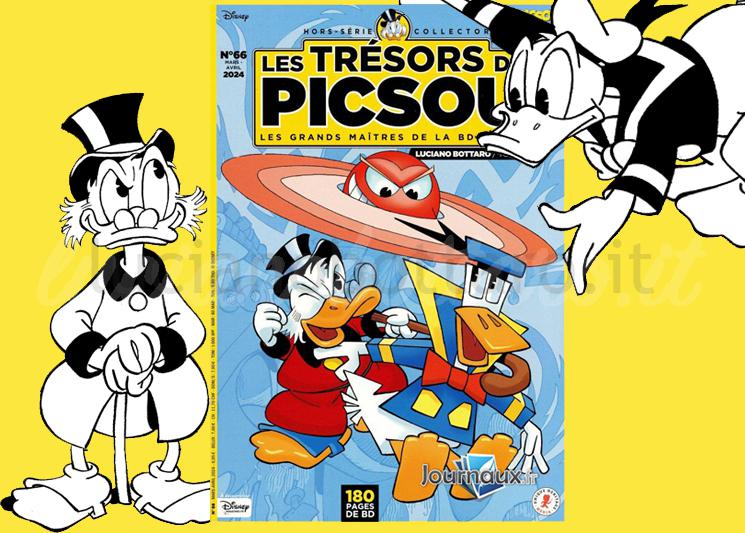 La copertina di “Les Trèsors de Picsou – Les grands Maitres de la bd Disney” HS n° 66, dove un satellite sghignazza alle spalle di un Zio Paperone e un Paperino deformati lascia pochi dubbi sul fatto che, anche questo speciale della pubblicazione Disney francese, come il precedente uscito a fine anno, sia dedicato a Luciano Bottaro.